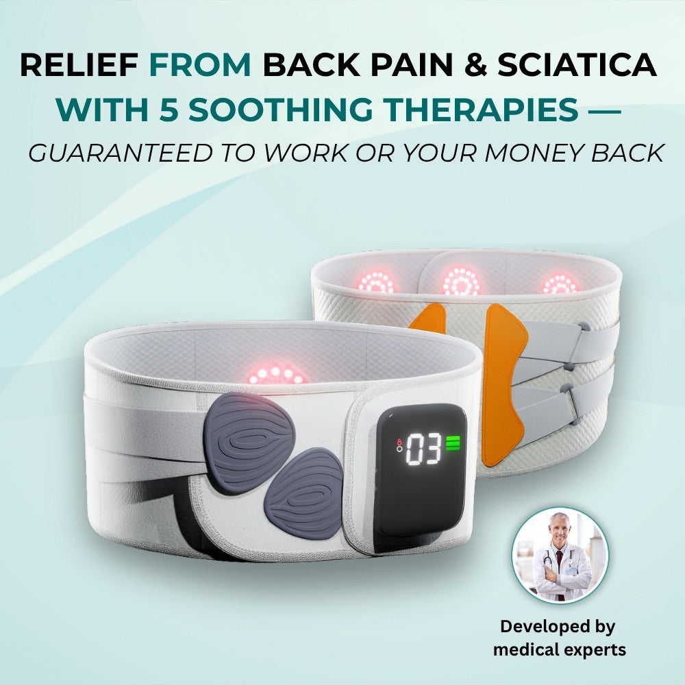BackRelief™ is a doctor-recommended 5-in-1 therapy belt designed to relieve lower back pain, sciatica, and stiffness from the comfort of your home. It combines heat, massage, red light therapy, spinal decompression, and compression to target the root cause of pain — not just the symptoms. Experience real relief in minutes a day and restore your posture, flexibility, and comfort naturally.